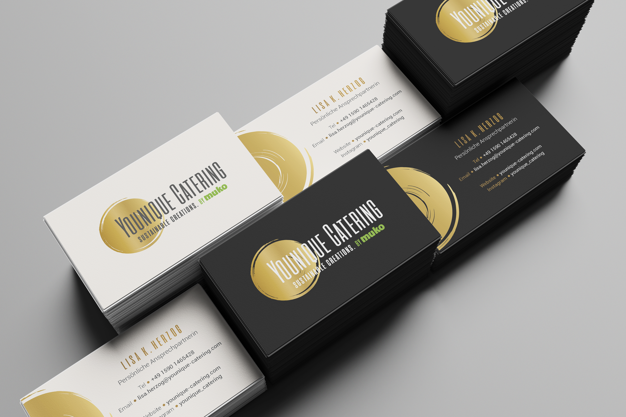 Younique Catering verkörpert veganes High-Class-Catering mit Herz, Haltung und visionärem Anspruch. Der goldene Teller im Logo steht für Bewegung, Wandel und den kontinuierlichen Fortschritt in der Kulinarik – ein Symbol für Genuss, der niemals stillsteht. Das Corporate Design verbindet einen eleganten Anthrazit-Farbton mit warmen Goldakzenten und verleiht der Marke eine hochwertige, sinnliche Ausstrahlung. So entsteht ein Auftritt, der Nachhaltigkeit, Kreativität und kulinarische Hingabe spürbar macht.